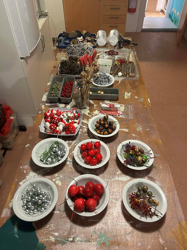 På bordene lå bl.a. gran, kogler, perler og små julebær klar til brug til dekorationer, og de fremmødte kastede sig engageret over at male, lime, sy og dekorere. Resultatet blev en række personlige og flotte juleprojekter, som spreder glæde.
